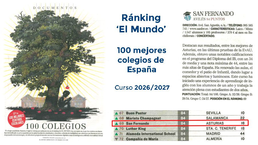 El periódico 'El Mundo' ha publicado su ránking de los '100 Mejores Colegios' privados y concertados de España, en el que el Colegio Internacional San Fernando, un año más, destaca por su proyecto educativo, equipo humano e instalaciones. El diario ofrece todos los años esta clasificación como una manera de orientar a los padres sobre las mejores instituciones educativas, en esta caso de cara al curso 2026-2027.
